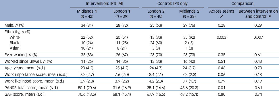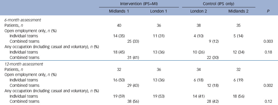 Implementation of IPS was assessed by service-user consultants who were independent of services and the research team, using version 8 of the IPS Fidelity Scale from the Dartmouth IPS Supported Employment Center.Reference Bond, Peterson, Becker and Drake17 Scores on this measure for the four teams ranged from ‘good’ (both London teams and the intervention team in the Midlands had scores of 111 to 114 out of a possible total of 125) to ‘exemplary’ (the control team in the Midlands with a score of 116). All four teams were rated as having IPS fully integrated with the mental health team. However, two teams - one in the intervention arm and one in the control arm - experienced gaps in the availability of IPS specialists when staff moved on or were absent through illness (in both instances over comparable 6-month periods between December 2009 and June 2010).