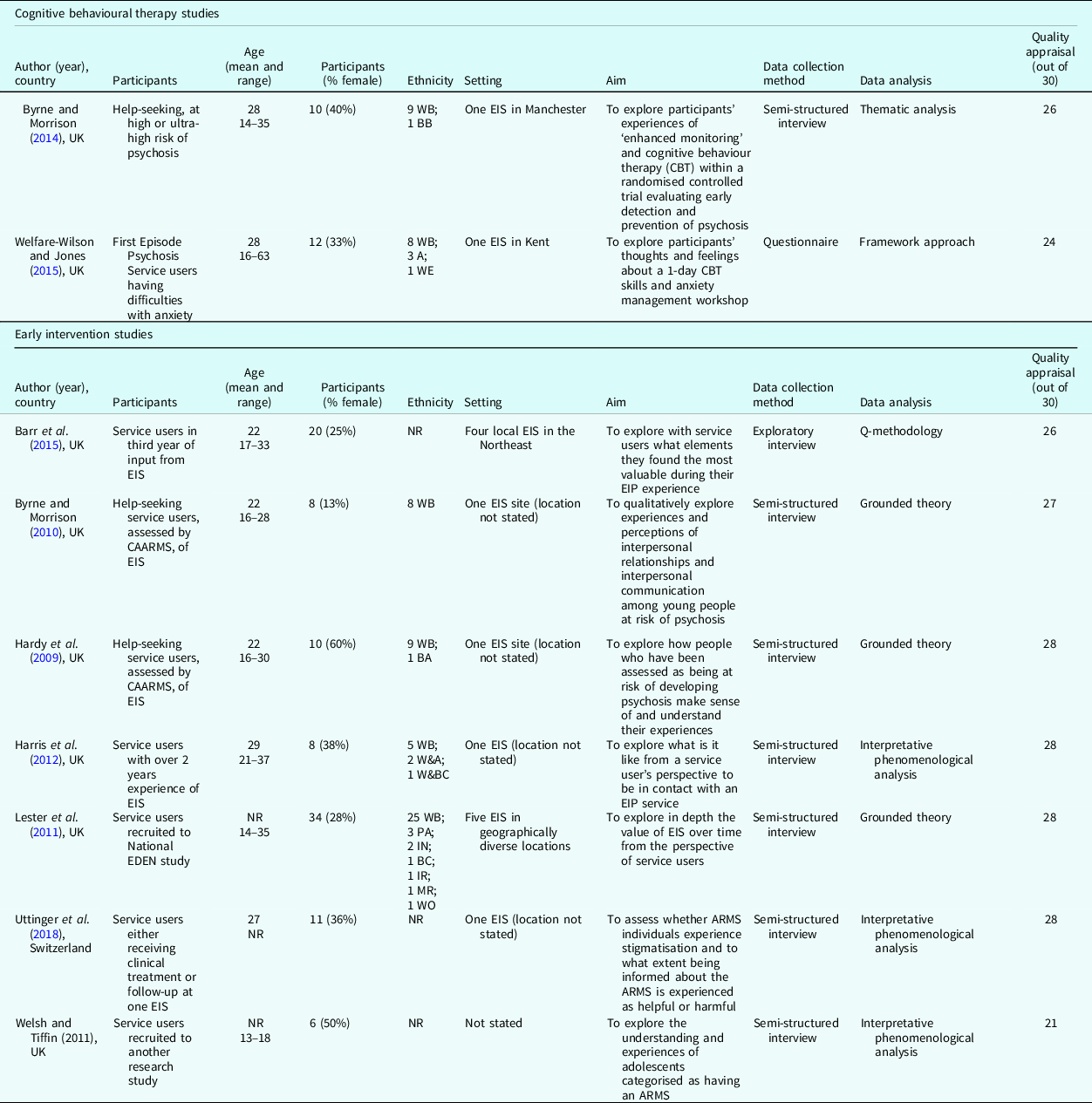The nine eligible studies consisted of five ARMS and four FEP studies. Two were CBT studies (Byrne and Morrison, Reference Byrne and Morrison2014; Welfare-Wilson and Jones, Reference Welfare-Wilson and Jones2015), three made reference to CBT (Barr et al., Reference Barr, Ormrod and Dudley2015; Byrne and Morrison, Reference Byrne and Morrison2010; Uttinger et al., Reference Uttinger, Koranyi, Papmeyer, Fend, Ittig, Studerus, Ramyead, Simon and Riecher-Rössler2018) and the remainder refer to psychological intervention (Hardy et al., Reference Hardy, Dickson and Morrison2009; Harris et al., Reference Harris, Collinson and das Nair2012; Lester et al., Reference Lester, Marshall, Jones, Fowler, Amos, Khan and Birchwood2011; Welsh and Tiffin, Reference Welsh and Tiffin2012). We might assume psychological intervention pertained to use of CBT, especially given national guidelines (NICE and NHSE, 2016); however, we cannot draw firm conclusions around this, making generalisations difficult.