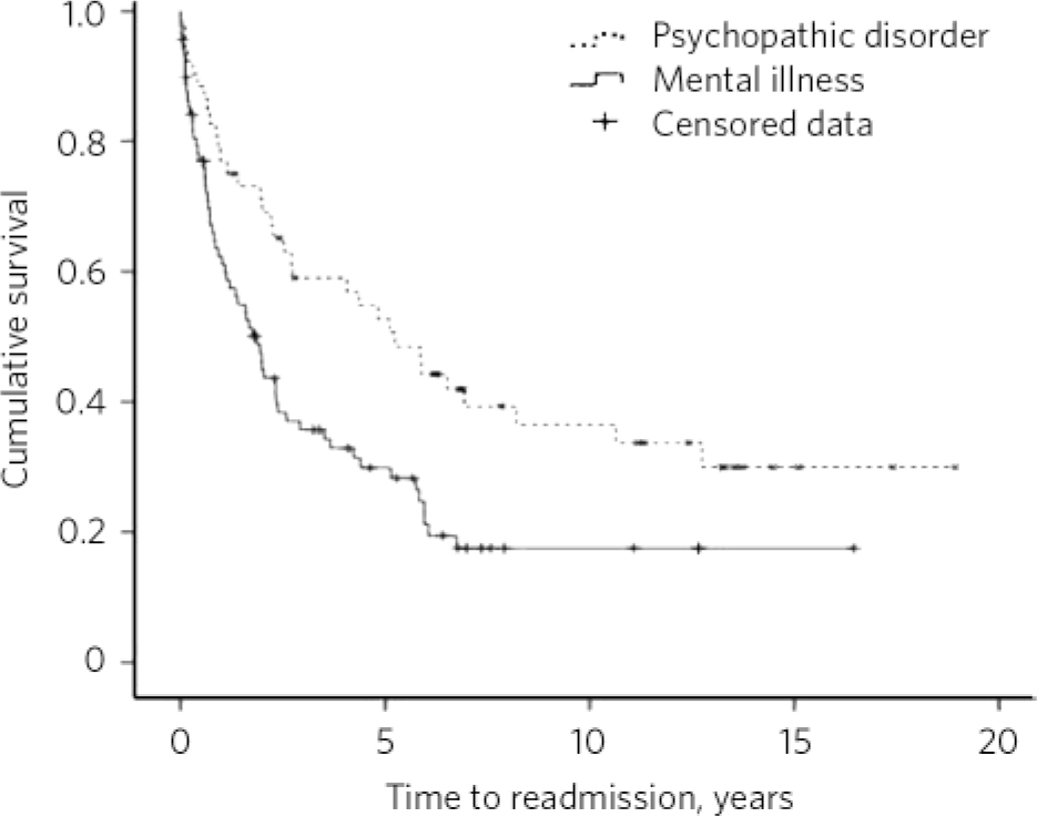 Of those discharged directly to the community, only previous in-patient treatment and having a mental illness were associated with shorter time to first readmission. Previous in-patient treatment was also a predictor of readmission to any hospital. In addition, a history of self-harm was associated with a decreased risk of readmission. This may be explained by self-harm being more common in those with a classification of psychopathic disorder compared with mental illness, a predictor that approached significance. It is clinically intuitive that the mentally ill group would have more previous and future hospital admissions. Indeed, in our cohort two-thirds of men with a Mental Health Act classification of mental illness had a previous admission compared with less than half of men with a classification of psychopathic disorder (further information available from authors). Conversely, patients with a classification of psychopathic disorder had a shorter time to reconviction than those with mental illness. Reference Gibbon, Huband, Bujkiewicz, Hollin, Clarke and Davies14 Incidentally, the risk of death for patients with a classification of either mental illness or psychopathic disorder was higher than that for the general population. However, although the risk of death was higher for patients with mental illness compared with psychopathic disorder, the difference was not significant. Reference Clarke, Davies, Hollin and Duggan11