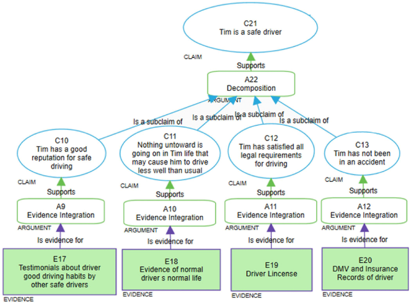 Consider the scenario, used in Holloway (Reference Holloway2015), where an assurance case is constructed with the intent to convince Jon’s father that Tim (a college student known to the family) is a safe driver to take Jon (a teenager not yet of driving age) to a football game in Tim’s car. The assurance case, as shown in Figure 1 (uses Assurance 2.0 format i.e., elaborated in the next section), has a top-level claim “Tim is a safe driver” (top-most blue ellipse), that is supported by several fine-grained sub-claims (lower level blue ellipses) and corroborating evidence (purple rectangles at the leaf level) that establishes Tim’s capability to drive safely. Jon’s father must evaluate the assurance case and determine if he is convinced. If not, he must explain.