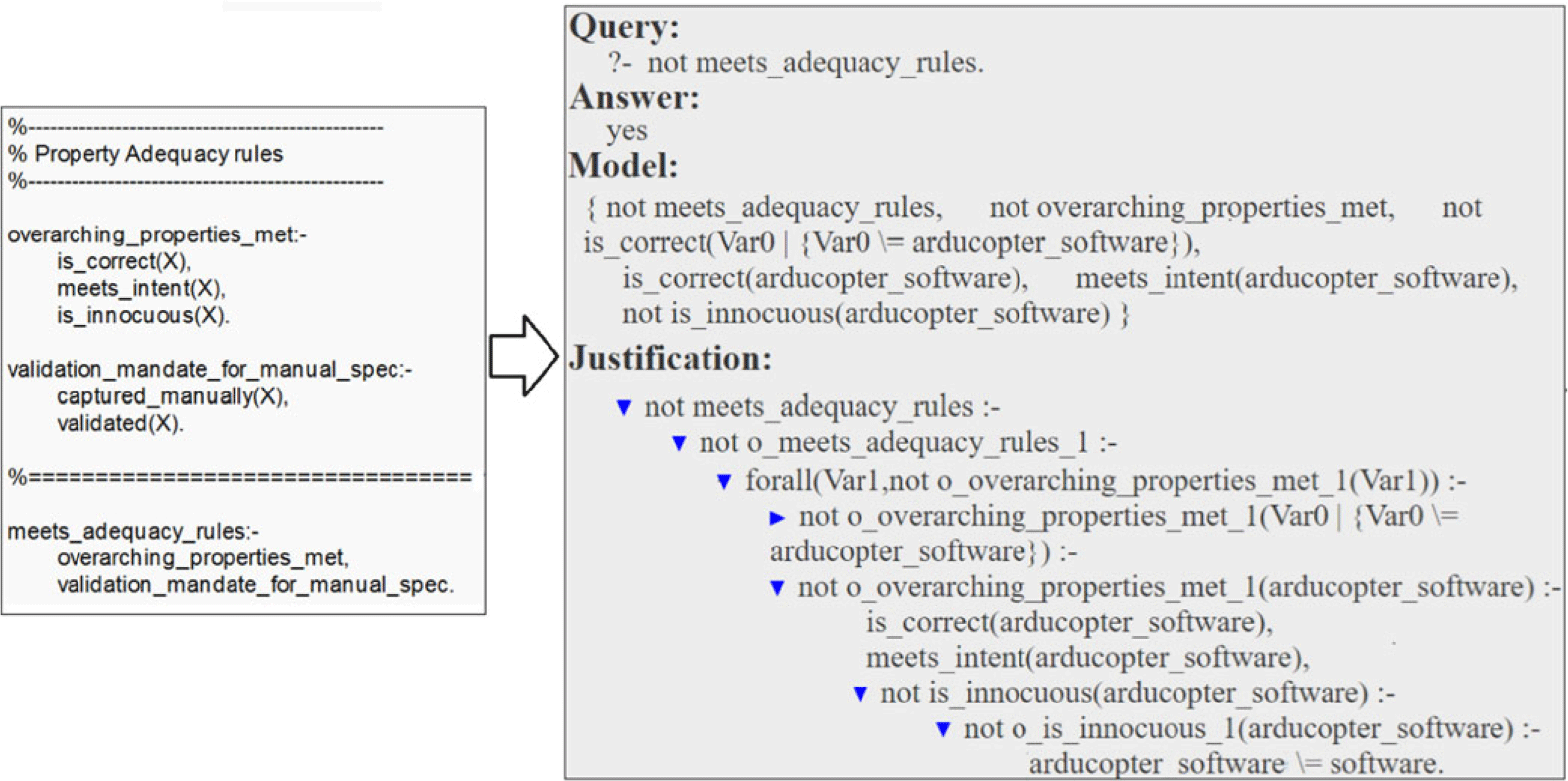 For instance, consider one of the adequacy rules defined for ArduCopter, which checks if the three overarching properties, namely meets_intent, is_correct, and innocuous, are satisfied, as shown in Figure 11. When analyzed using the exported program of the Arducopter case, the s(CASP) engine searches through the case to identify instantiations that fulfill this rule. If this condition is not met, as illustrated on the right side of Figure 11 for explanatory purposes, by negating the query to s(CASP), we get a justification tree, detailing the reason for the ‘inadequacy’, such as the absence of the is_innocuous property for the arducopter_software object.