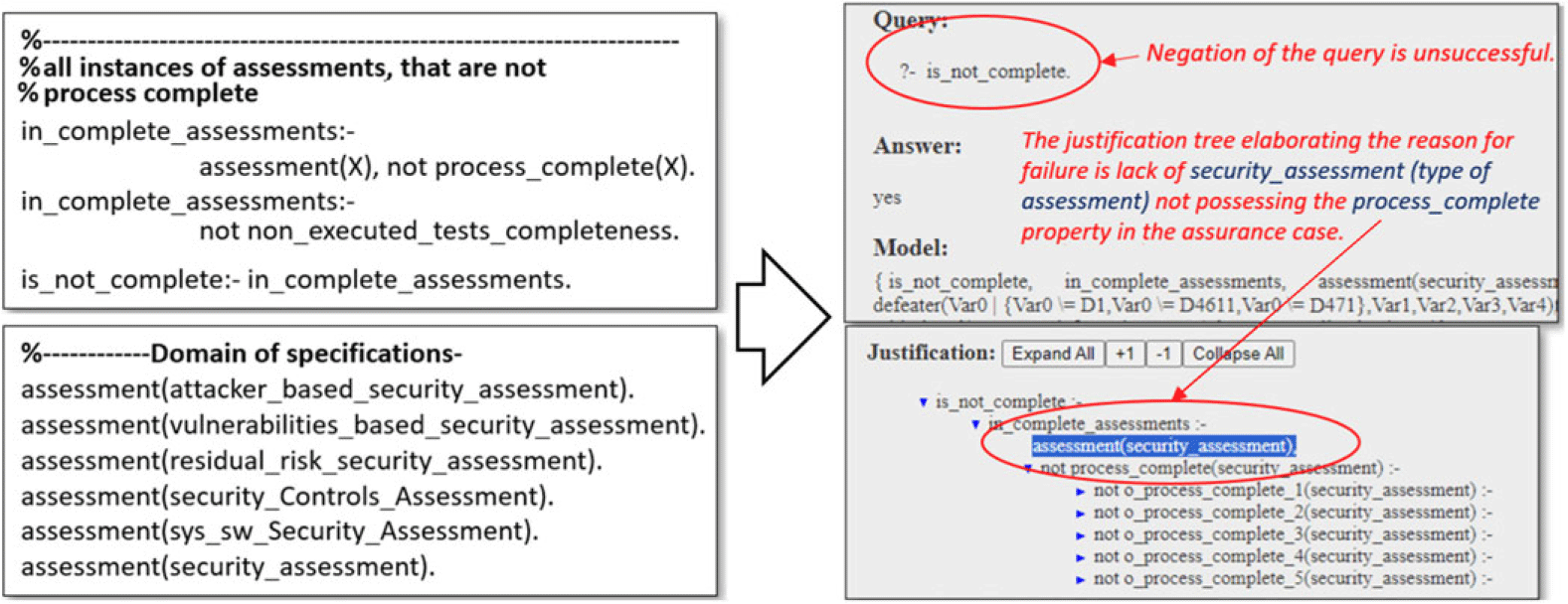 In the Arducopter case, we established a completeness property assessment(X) and not process_complete(X). When the negation of this rule was executed in s(CASP), along with the assurance case and the definition of the domain types and their instantiations, the result was a justification explaining the reason for the failure. As illustrated in the Figure 12, the lack of the process_complete property in the assurance case for the security_assessment instance of type assessment was identified as the cause of failure.
