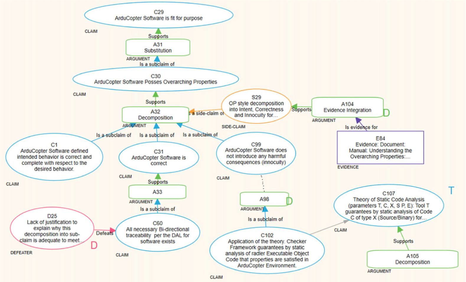 Figure 2 depicts a snippet of the ArduCopter assurance case constructed using the ASCE tool. The overall structure of the assurance case aims to demonstrate that the ArduCopter exhibits the three fundamental overarching properties–intent, correctness, and innocuity –that are indispensable for ensuring the safety and security of the system. The top-level claim of ArduCopter (the uppermost blue ellipse) is broken down into detailed sub-claims (blue ellipses) through the use of arguments (green rounded rectangles), which are substantiated by evidence (purple rectangles) at the leaf level. The rationale behind these refinements is documented in side-claims (yellow ellipses). Moreover, any doubts, concerns, or counter-claims regarding any aspect of the case are captured as defeaters (red ellipses), described by Bloomfield et al. (Reference Blommfield, Netkachova and Rushby2024). Several theories (blue ellipses adorned with a “T” symbol) were employed in formulating the ArduCopter assurance case, such as the theory of static analysis (ID C107) and its application in a sub-claim (ID C102). The complete details of this case are available in Varadarajan et al. (Reference Varadarajan, Bloomfield, Rushby, Gupta, Murugesan, Stroud, Netkachova and Wong2024a).