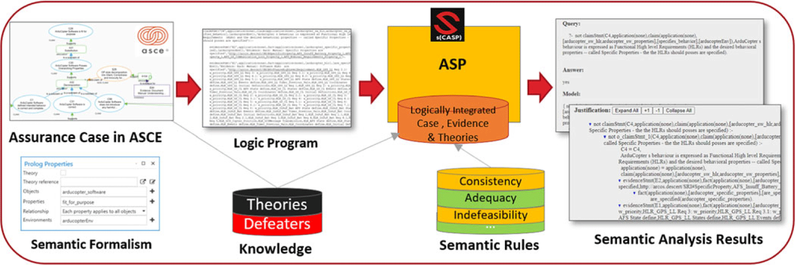 4. 4. Semantic Reasoning using s(CASP): The predicate form of the assurance case is systemically analyzed for the various properties using s(CASP) engine and results are reported in a user-friendly manner.