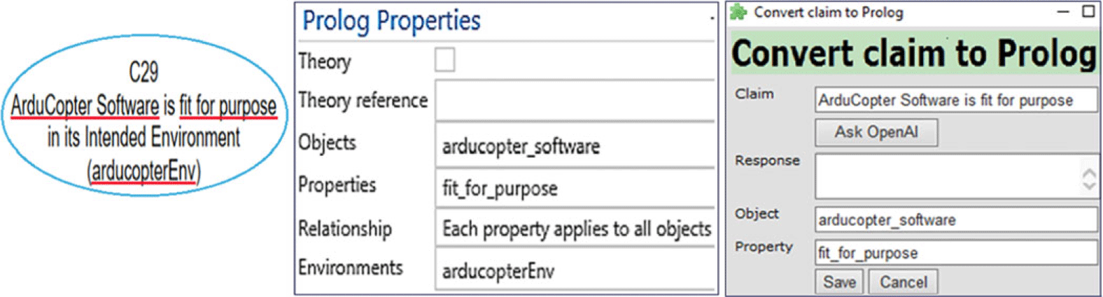 Assurance cases consist of blocks or “nodes” that delineate the properties or relationships relevant to objects within a specific environment. The “Properties,” “Objects,” and “Environment” for each node are identified and defined, enabling us to formally articulate statements like “Object O satisfies property P in environment E.” For instance, the assertion “ArduCopter Software is fit for purpose in its Intended Environment” can be broken down into (i) “Object = ArduCopter Software,” (ii) “Property = fit for purpose,” and (iii) “Environment = Intended Environment (arducopterEnv).”