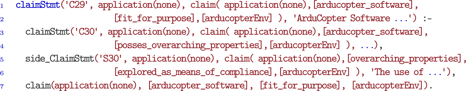 As mentioned earlier, this property concerns indisputable entailment of top-level claim. Formally, we represent this property as a query that includes the top-level claim. We have enhanced the ASCE tool to automatically and separately export the top-level claim in ASP as both positive and negative queries in addition to exporting the entire assurance case along with defeaters. The snippet of the exported query of ArduCopter assurance case’s top-level claim is shown in Figure 8.