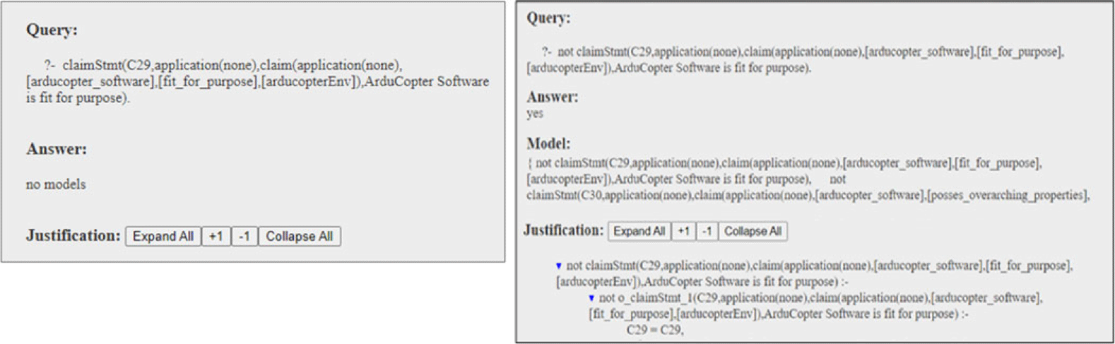 When the positive query is successfully executed in s(CASP) and an explanation is provided, it signifies that the assurance case indeed possesses this property. Conversely, if the negative query is successfully executed, s(CASP) returns the unresolved defeaters as violations, as illustrated in Figure 9. While the specifics of the model and justification depend on the system being analyzed, Figure 9 primarily shows how the results of positive and negative queries will be displayed.
