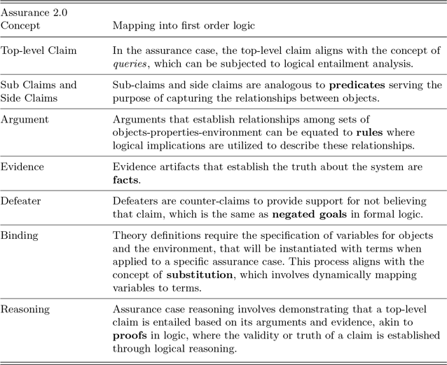 Table 1. Concept mapping between assurance 2.0 and first order logic