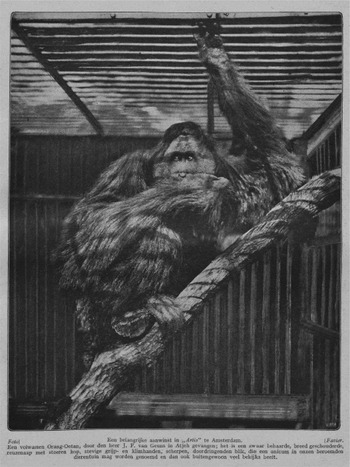 Figure 2. Jacob the orangutan at the Artis Zoo in Amsterdam in 1926. J.F. van Geuns collected Jacob in Aceh in 1926. C.A. Périn purchased and sold him to Coenraad Kerbert, the director of Artis Zoo in Amsterdam. From the 2 October 1926 issue of De Prins der Geïllustreerde Bladen, obtained at the Centrale Bibliotheek in Rotterdam.