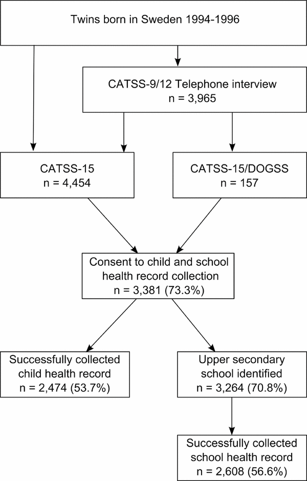 Child health records were requested from county council archives (Swedish: Landstingsarkiv) in the county of residence for twins born 1993–1995. Records of twins born in 1996 were requested from the county of residence and the county of birth. Lists of twins who had consented to record collection were sent to the Swedish National Board of Student Aid (Centrala Studiestödsnämnden, CSN), a government organization supplying financial aid for studies, including at upper secondary school level. As a result, the identity of the school for any given individual can be retrieved through the CSN, which was possible in n = 3,264 cases, 96.5% of all consenting twins. School health records were requested in a letter addressed to the school health department or nurse at the upper secondary school of the twin, as identified by the CSN. In some instances, child health records were retrieved along with the school health records, and sometimes missing school health records could be retrieved from the county council archive. For the purposes of this study, a collected record of either type, independent of source, was considered successful.
