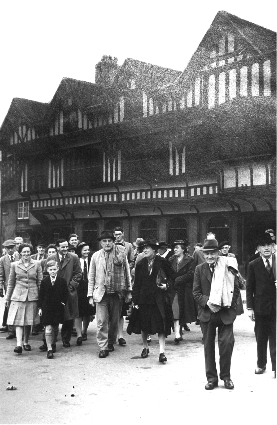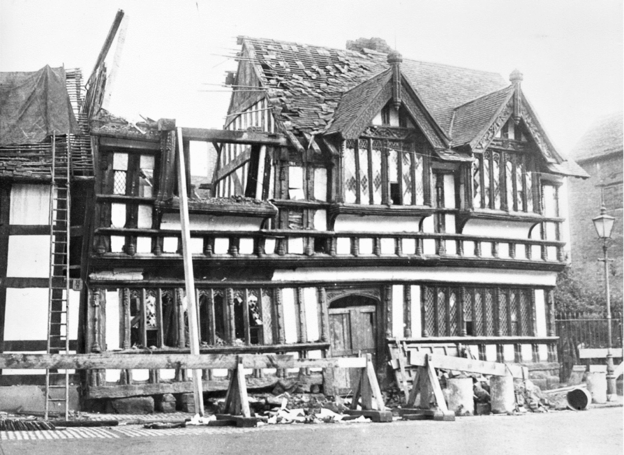 Timber-framed buildings were very much a visible presence in Coventry between the wars. Local historian Mary Dormer-Harris in 1908 noted that had some of the buildings in the town been better maintained, Coventry would have compared with medieval Nuremburg.Footnote 35 Inter-war traffic schemes in the city centre had severely altered some of the last remaining pockets of medieval character in the central core. The most notable had been the elimination of the medieval Butcher Row and Ironmonger Row area in 1936 to create Trinity Street. Nevertheless, important buildings like St Michael's cathedral, Holy Trinity church, St Mary's Guildhall and others such as St John the Baptist church and Ford's and Bond's Hospitals remained, and several ordinary medieval vernacular buildings survived outside the historic core.Footnote 36