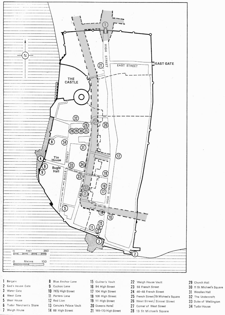 Figure 2: Proposed route of the proposed north–south road (Castle Way) through the centre of medieval Southampton. After P.A. Faulkner, ‘The surviving medieval buildings’, in C. Platt and Coleman-Smith, Excavations in Medieval Southampton (Leicester, 1975).