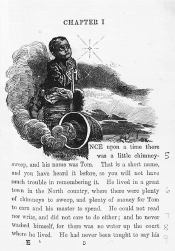 The Water-Babies, Charles Kingsley's “fairy-tale for a land-baby,” opens in a manner that typifies mid-Victorian social reform discourse.Footnote 3 In the novel's beginning paragraphs, the narrator adopts a Dickensian voice of sardonic humor as he catalogues a litany of horrors regarding the novel's young hero – Tom the “little chimney sweep” (WB 1; ch. 1). We learn that Tom's master appropriates Tom's earnings for drink, that Tom has received neither religious nor secular education, and that he is starved and beaten daily. Not only is Tom “bullied and knocked about” by his master Thomas Grimes, but the nature of Tom's labor is such that he “crie[s] when he h[as] to climb the dark flues, rubbing his poor knees and elbows raw; and when the soot g[ets] into his eyes, which it d[oes] every day in the week” (WB 1; ch. 1). Tom “lives in a great town in [England's] . . . North country” and has “never bathed” because “there is no water up the court where he lives” (WB 1; ch.1). Both Tom and Grimes have been sent to prison – Tom “once or twice,” Grimes several times a week due to his poaching (“Mr. Grimes and the collier lads poached at times” WB 3; ch.1). Later in the novel, we learn that one of Tom's parents has died and that the other has been transported to Botany Bay (WB 44; ch.2).