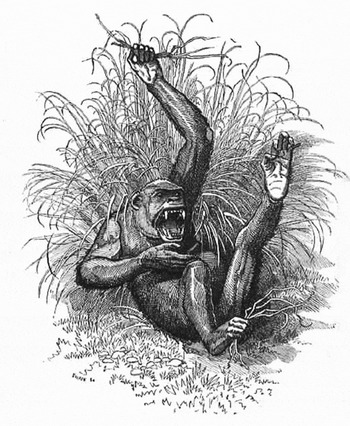 Kingsley's racial anxieties culminate in The Water-Babies with his tale of the “Doasyoulikes,” a fable that also betrays Kingsley's adherence to monogenetic theories of racial difference. In Chapter Six, Tom and Ellie peruse Mrs. Bedonebyasyoudid's photographic history of the “great and famous nation of the Doasyoulikes, who came away from the country of Hardwork, because they wanted to play on the Jews’ harp all day long” (WB 131; ch. 6). From an Edenic beginning, the Doasyoulikes, who are as lazy as “oysters,” suffer a series of setbacks and face increasing hardships: “they had to live very hard, on nuts and roots which they scratched out of the ground with sticks” (WB 133; ch. 6). Tom notes that in the photographs, the Doasyoulikes are “growing no better than savages” and Ellie comments on “how ugly they are all getting” (WB 133; ch. 6). Mrs. Bedonebyasyoudid explains: “Yes; when people live on poor vegetables instead of roast beef and plum-pudding, their jaws grow large, and their lips grow coarse, like the poor Paddies [Irishmen] who eat potatoes” (WB 133; ch. 6, my emphasis). Eventually chased into the trees by lions, the Doasyoulikes devolve over the centuries, like the wild Irish Kerry-men who would not listen to St. Brendan, into gorillas: “they were fewer still, and stronger, and fiercer; but their feet had changed shape very oddly, for they laid hold of the branches with their great toes as if they had been thumbs, just as a Hindoo tailor uses his toes to thread his needle . . . . ‘Why,’ cried Tom, ‘I declare they are all apes’” (WB 134; ch. 6).