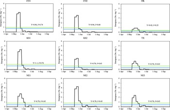 Winter wheat–fallow (WW-F) or winter wheat–summer crop–fallow (WW-S-F) are predominant crop rotations in the SGP region (Peterson and Westfall Reference Peterson and Westfall2004). Due to shallow soil and limited annual rainfall, NT is often practiced for soil and moisture conservation in the region. Weed seeds are generally concentrated in the upper 5 cm of the soil profile in NT system compared to deeper dispersion in conventional tillage systems (Buhler Reference Buhler1992; Cardina et al. Reference Cardina, Regnier and Harrison1991; Clements et al. Reference Clements, Benoit, Murphy and Swanton1996). Small-seeded weeds such as Palmer amaranth can emerge more easily from shallow depths (Buhler et al. Reference Buhler, Mester and Kohler1996; Oryokot et al. Reference Oryokot, Murphy and Swanton1997; Webb et al. Reference Webb, Smith and Schulz-Schaeffer1987). Knowledge on Palmer amaranth emergence biology (emergence pattern and periodicity) in the NT semiarid SGP region can aid in developing effective Palmer amaranth control strategies by optimizing herbicide applications and cultural practices (crop planting dates, reduced row spacing, strategic tillage, cover crops, etc.; Jha and Norsworthy Reference Jha and Norsworthy2009; Nazarko et al. Reference Nazarko, Van Acker and Entz2005). Understanding the emergence pattern of geographically distant Palmer amaranth populations from the SGP region can help direct management practices to target the peak emergence period and emergence duration of Palmer amaranth for depleting soil seed bank, which is critical for mitigating the further spread of herbicide resistance among field populations. The main objectives of this research were to 1) characterize the emergence pattern of Palmer amaranth populations collected from the SGP region in a common garden study and 2) determine the emergence periodicity of these populations under field conditions. It was hypothesized that variation in annual weather conditions might impact the emergence characteristics (especially emergence duration) of selected Palmer amaranth populations from the SGP region.