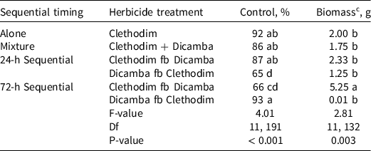 Table 2. Junglerice control (21 DAT) comparing 24-h and 72-h sequential applications of clethodim applications preceding and following dicamba application across six environments (populations) in the greenhouse.a, b