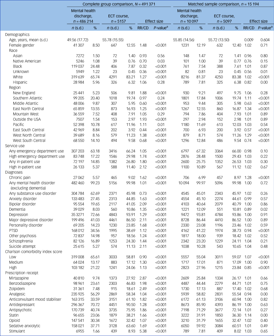 For all matched individuals (ECT and controls), we extracted demographic, clinical, pharmacological and service use variables from the EMR. We assessed time-varying demographic factors, such as region of residence and age, from the start of each calendar year. We assessed gender and race based on the most common values observed for each person across all years. We assessed all diagnostic and pharmacological variables for the 1 year before the final day of an index ECT course or, in the case of the control population, the date of in-patient discharge. In addition to binary indicators identifying the presence of a diagnosis, we calculated a Charlson comorbidity index score to summarise severity of medical diagnoses in the year before ECT course or in-patient discharge. Reference Quan, Li, Couris, Fushimi, Graham and Hider22 For all patients, we assessed the number of medical in-patient discharges and the number of emergency use visits for the 1 year before ECT index course or in-patient discharge. For each type of service use, individuals were characterised as having any use or high use (two or more visits).