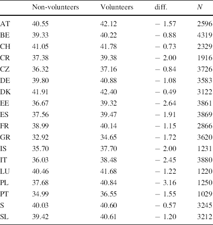 As our study covers diverse historical, cultural, and economic settings,Footnote 2 benefits from helping others are observed in diverse contexts (Aknin et al. Reference Aknin, Barrington-Leigh, Dunn, Helliwell, Burns, Biswas-Diener and Norton2013). The elderly are likely to feel the need to volunteer–volunteering substitutes for their prior roles in society and provides opportunities for social contact and gives meaning to their lives (Sherman and Shavit Reference Sherman and Shavit2012). On the other hand, certain country-specific customs strengthening family bonds make elderly take care of grandchildren, which limits their availability to be involved in formal volunteering activities. This may explain low rates in Southern and Eastern European countries (Wilson and Musick Reference Wilson and Musick1997; Dykstra and Fokkema Reference Dykstra and Fokkema2011; Hank Reference Hank2007). Moreover, the elderly from Eastern European countries experienced forced “volunteering” during socialism when people were required to devote their time to social, cultural, and political causes. This life-course experience may lower their desire to provide assistance to others (Kuti Reference Kuti2004; Anheier and Salamon Reference Anheier and Salamon1999).