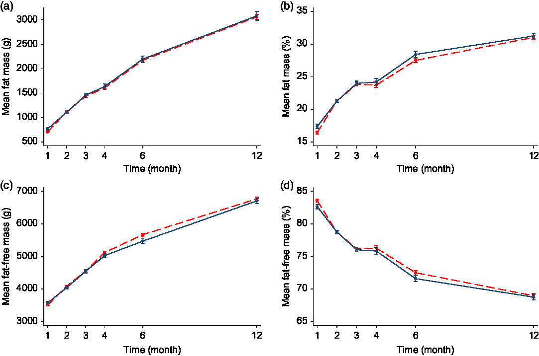 To test whether FM and FFM differed between groups (goat-milk formula and cow-milk formula, or combined formula-fed and breastfed infants), linear regression models were fitted using a time-by-group interaction term, with time treated as categorical. An interaction term was included in the model to test whether the trajectory of body composition measures over time differed between the two groups, and estimates of the group differences were derived separately for each group and time point. A generalised estimating equation with autoregressive degree working correlation and robust variance estimation was used to account for repeated measures. Pairwise differences between groups were estimated for each time point (1, 2, 3, 4, 6 and 12 months). Both unadjusted and adjusted analyses were performed. Unadjusted analyses included only time, feeding group (cow-milk v. goat-milk formula or combined formula-fed v. breastfed) and the interaction between feeding group and time. The adjusted analyses included study centre, sex, maternal smoking during pregnancy and maternal education as covariates. For the sub-group analysis by maternal smoking status, unadjusted analyses included only time, feeding by smoking group and the interaction between group and time. The adjusted analyses included study centre and maternal education.