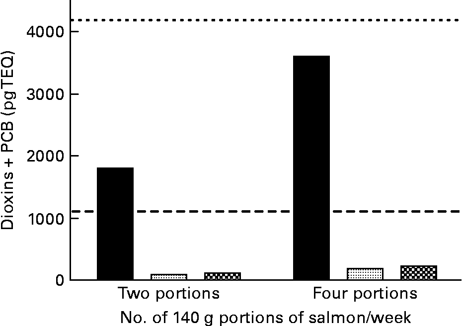 There is currently considerable interest in fish, and especially oily fish, as a means of increasing n-3 HUFA intake in populations that currently have low fish intake. However, while the benefits of consuming n-3 HUFA are widely known, there is also concern about the relative risks and benefits due to the presence of POP in oily fish(4, Reference Berntssen, Lundebye and Torstensen14, Reference Foran, Good and Carpenter16, 46). The current guideline of the UK FSA (www.food.gov.uk) suggests that we should consume up to four 140 g portions of oily fish per week. However, the FSA adds the caveat that girls and women of child-bearing age should only consume two 140 g portions of oily fish due to concerns that POP present in the fish might pose a risk to the developing fetus. Thus, for girls or women of child-bearing age, the FSA recommendation is in agreement with the EU Scientific Committee on Food that the maximum intake of PCDD/F+DL-PCB should be 2 pg/kg body weight per d(35). However, the FSA guideline suggests that boys, men and women over reproductive age can consume up to 8 pg/kg body weight per d. The salmon fed the cNFO diet in the present study would give 171 % of the weekly limit for girls and women of reproductive age or 86 % of the weekly limit value for boys, men and women over reproductive age, from two or four 140 g portions of cNFO salmon, respectively. However, salmon with these levels of POP would not be available for public consumption due to current EU limits on PCDD/F and DL-PCB in fish feeds(22). In a sample of standard production Scottish salmon analysed in our laboratory, the average PCDD/F+DL-PCB concentration in two 140 g portions was 493 pg TEQ. This represents 47 % of the value for girls and women of child-bearing age or 24 % of the limit for boys, men and women over reproductive age. By comparison, for the deNFO and SFO/RO/SO fish, consuming two or four 140 g portions represents only 9·0 and 10·8 % of the weekly limit for girls and women of reproductive age or 4·5 and 5·4 %, respectively, of the weekly limit for PCDD/F+DL-PCB for boys, men and women over reproductive age. While the POP concentrations are very low for both the deNFO and SFO/RO/SO salmon, the same two and four 140 g portions provide 147 and 81 % and 294 and 162 %, respectively, of the International Society for the Study of Fatty Acids and Lipids (ISSFAL) recommended weekly intake of EPA+DHA(8).