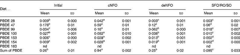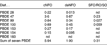 Table 3 Dietary concentrations (ng/g wet weight) of seven polybrominated diphenyl ether (PBDE) congeners in the control northern fish oil (cNFO), decontaminated northern fish oil (deNFO) and southern fish oil, rapeseed oil and soyabean oil (SFO/RO/SO) diets