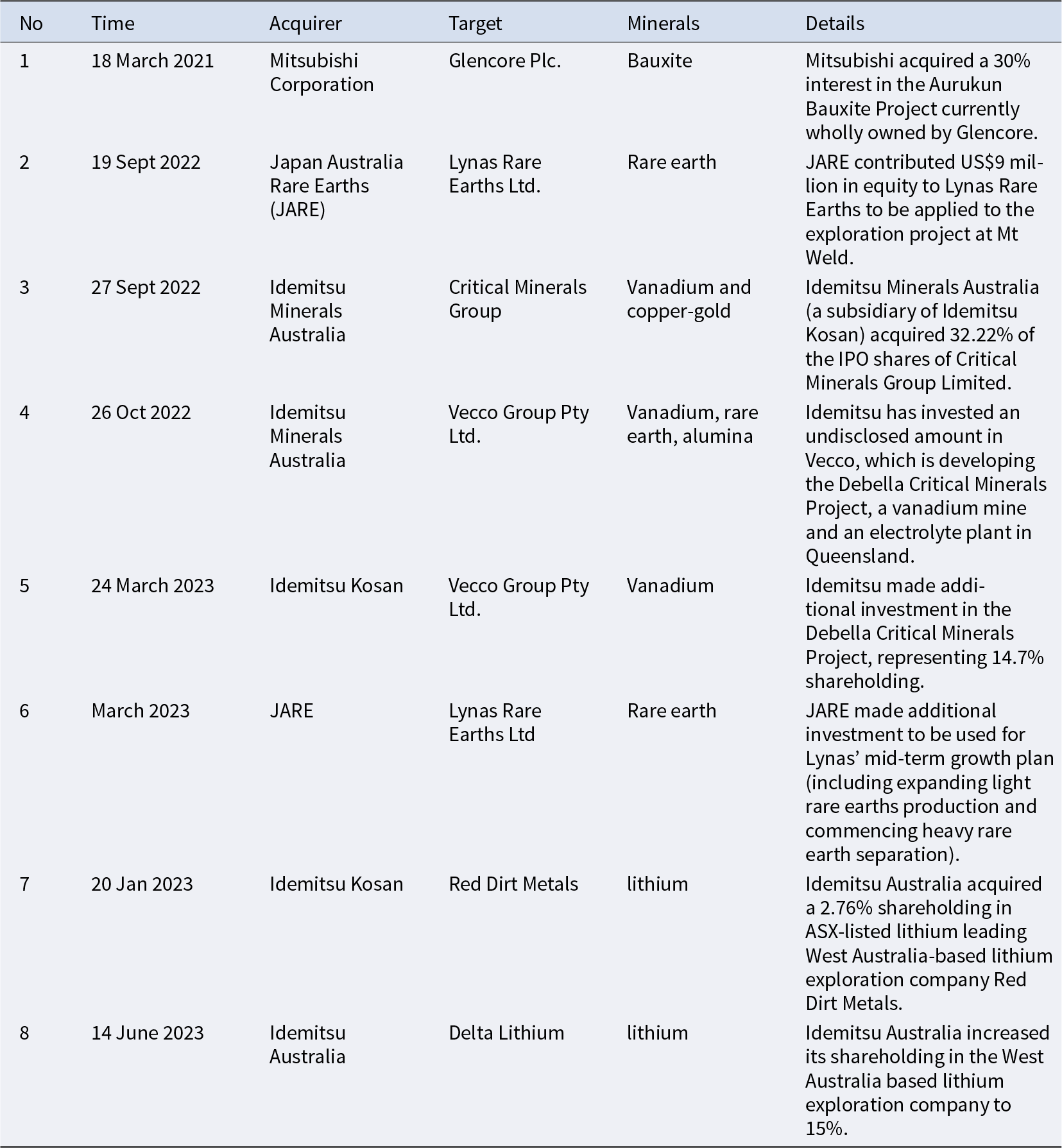 Annex B. Japanese Acquisitions of Australia’s Critical Mineral Producers From 2021 to 2023Footnote 205