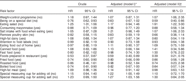 The risk of MetS related to dietary habits in the total population at the 10-year follow-up is demonstrated in Table 2. In model I, after adjustment for sex and age, participants who did not use a special measuring cup for adding oil (hazard ratio (HR)=1·22; 95 % CI 1·00, 1·49) and participants who did not use a special measuring cup for adding salt (HR=1·27; 95 % CI 1·03, 1·56) had a higher risk for MetS than the rest of the participants.