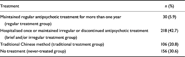 Thirty of the 510 patients (5.9%) maintained regular antipsychotic treatment (regular treatment group) for more than one year, and 156 (30.6%) received no treatment at all (never-treated group). The others were treated by a variety of agencies, including: trained practitioners of traditional Chinese medicine (such as acupuncture and herbal remedies - traditional treatment group), psychiatric hospitals, psychiatric out-patient clinics, and local healers, but received irregular treatment or discontinued treatment (brief and/or irregular treatment group), as shown in Table 1.