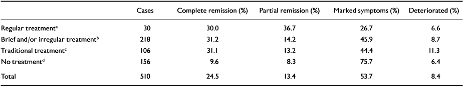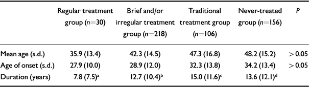 The results indicated that the duration of illness in the regular treatment group was significantly shorter than that in the brief and/or irregular treatment, traditional treatment and never-treated groups.
