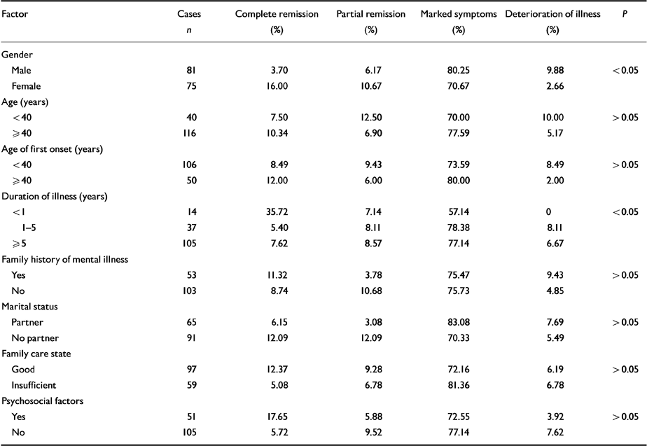 For the 156 patients with schizophrenia who had never received treatment, the study showed that patients' mean age, age of first onset, family history of mental illness, marital status, psychosocial factors and their family care state were not significantly related to the clinical outcome (P>0.05) (see Table 4). There were 58.3% patients who had no partner or had not married, and 37.8% of patients whose family care status was poor. All these results showed that their social support state was not good.