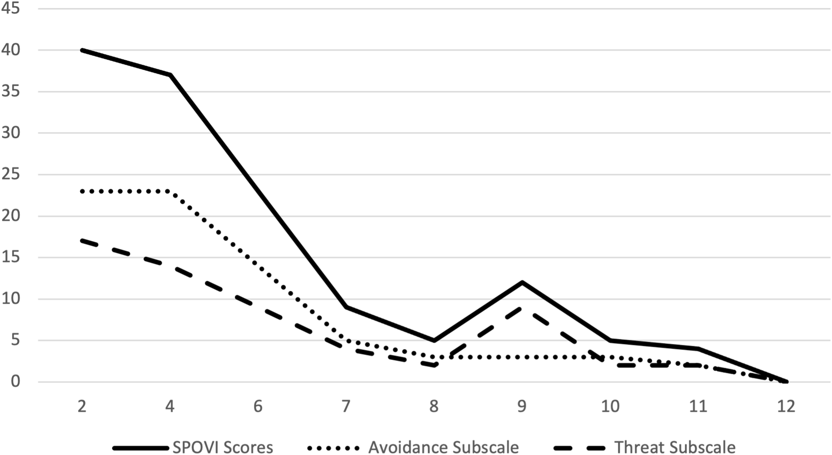 Maisie’s initial score on the SPOVI was 40/56, representing clinical levels of SPOV. Maisie scored 23/28 on the avoidance subscale and 17/28 on the threat monitoring subscale, reflecting her description of life being dictated by avoidance of vomit-related situations, reducing the likelihood of feeling threatened by vomit due to lack of exposure.