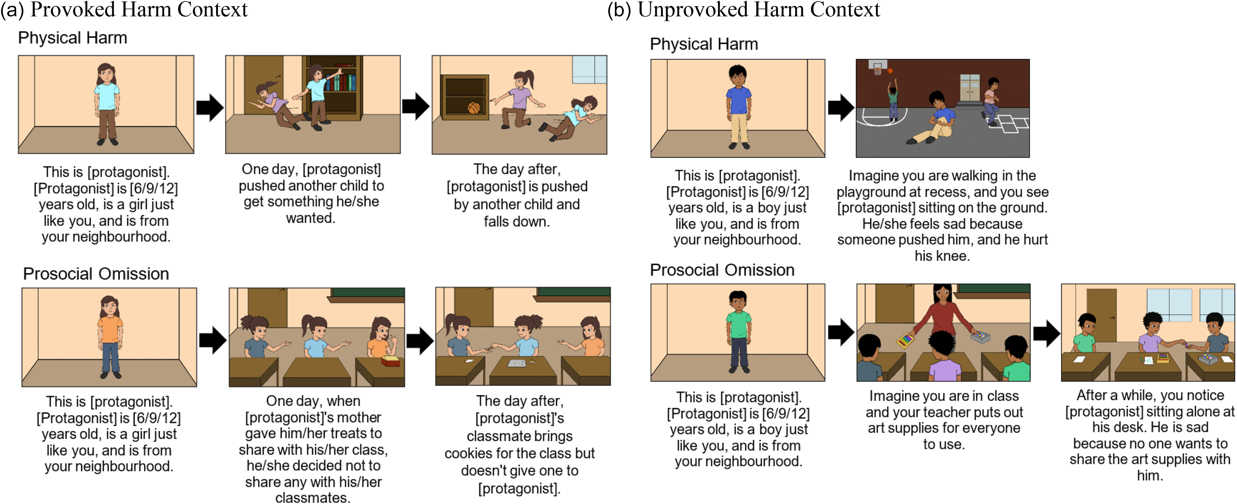 Children’s sympathy has been traditionally assessed in response to the suffering of victims from low-severity accidents (e.g., a parent or researcher hurting their knee; Davidov et al., Reference Davidov, Paz, Roth-Hanania, Uzefovsky, Orlitsky, Mankuta and Zahn-Waxler2021; Zahn-Waxler et al., Reference Zahn-Waxler, Radke-Yarrow, Wagner and Chapman1992) and chronic poverty or illness (Eisenberg et al., Reference Eisenberg, Fabes, Carlo, Troyer, Speer, Karbon and Switzer1992; MacEvoy & Leff, Reference MacEvoy and Leff2012; Zhou et al., Reference Zhou, Valiente and Eisenberg2003). When children themselves are asked to identify incidents that typically incite sympathy, they report that they feel sorry for innocent victims of aggression (physical, verbal, relational), accidents, and property damage (MacEvoy & Leff, Reference MacEvoy and Leff2012). Harm that results from peer conflict, however, is not as straightforward as reflected in these typical measurement approaches. For example, a victim of harm may have a history of engaging in harmful acts themselves (i.e., a bully who is also a victim; Demaray et al., Reference Demaray, Malecki, Ryoo and Summers2021). As such, how children emotionally respond as witnesses of peer harm often involves incorporating multiple pieces of information, such as the severity of harm, the intentions of the individuals involved, outcomes of harm, and the victim’s prior behaviors and status (Ball et al., Reference Ball, Smetana and Sturge-Apple2017; Smetana et al., Reference Smetana, Campione-Barr and Yell2003; Yoo & Smetana, Reference Yoo and Smetana2022).