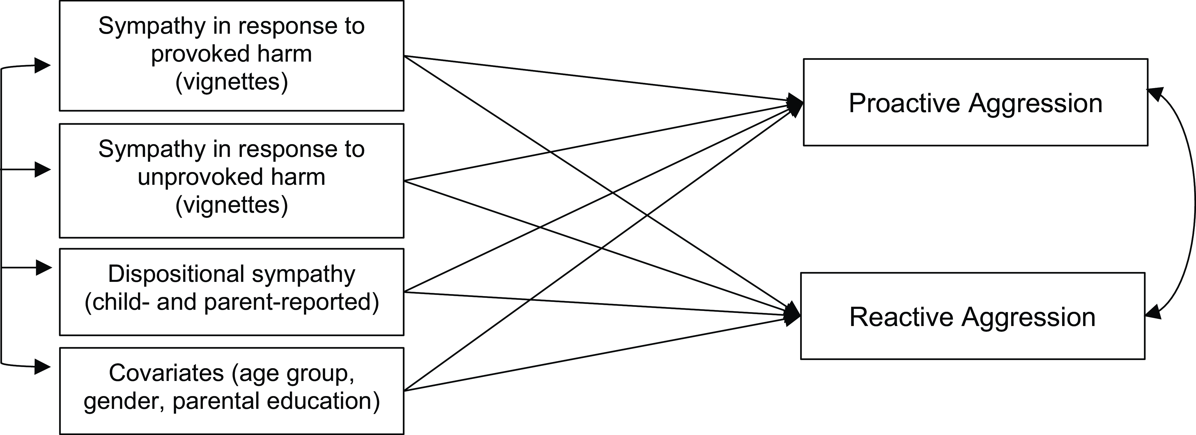 Second, we investigated whether children’s sympathy following provoked and unprovoked harm were differentially associated with their proactive and reactive overt aggression. We focused on overt aggression due to its associations with life-course persistent antisocial behavior (Di Giunta et al., Reference Di Giunta, Pastorelli, Eisenberg, Gerbino, Castellani and Bombi2010). We considered children’s dispositional sympathy (child- and parent-reported) as a comparison measures of sympathy as it reflects unique aspects of children’s sympathetic responding. We hypothesized that sympathy in the provoked harm context would be negatively related to reactive aggression given that a lack of sympathy in this context may reflect endorsement of retaliation which is characteristic of reactive aggression (Bondü & Krahé, Reference Bondü and Krahé2015; McDonald & Lochman, Reference McDonald and Lochman2012). We expected sympathy in both contexts to be negatively associated with children’s proactive aggression given that proactive overt aggression is related to callousness (i.e., lack of sympathy; Jambon et al., Reference Jambon, Colasante, Peplak and Malti2019; Peplak & Malti, Reference Peplak and Malti2017). Similarly, replicating prior work, we expected both parent- and child-reported dispositional sympathy to be negatively associated with children’s proactive aggression (Jambon et al., Reference Jambon, Colasante, Peplak and Malti2019). Within exploratory mutligroup models, we anticipated that associations between dispositional sympathy and aggression would become stronger with age because as children grow older, they develop greater awareness of others’ emotions and moral standards, which makes sympathy a stronger inhibitor of aggression (Tampke et al., Reference Tampke, Fite and Cooley2020). We included gender as a covariate in our model as boys tend to behave more aggressively than girls (Card et al., Reference Card, Stucky, Sawalani and Little2008).