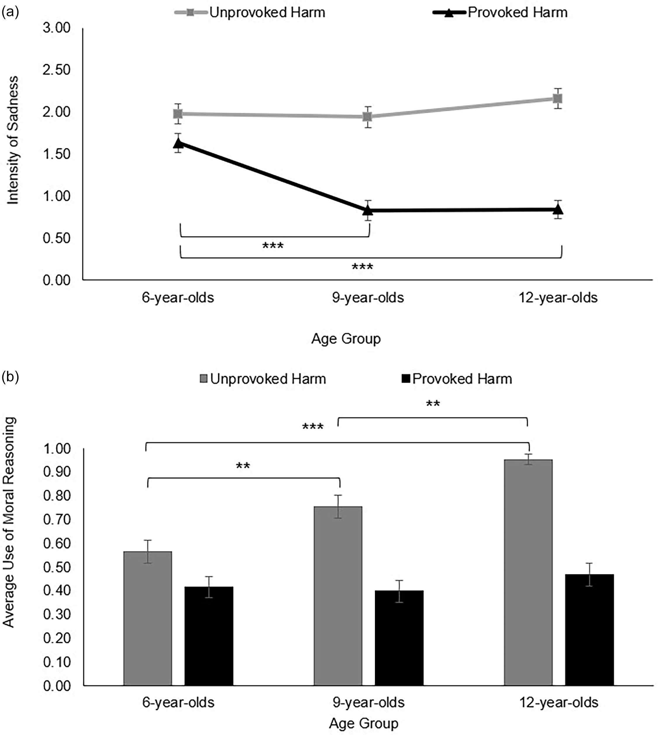 Figure 3. Average (a) intensity of sadness and (b) use of moral reasoning by context and age group. Note. Error bars represent standard errors of the mean. Moral reasoning scores ranged from 0–1, whereby children who did not use moral reasoning to justify their emotions across stories received a score of 0, those who used moral reasoning in at least one of the stories within each context received a 0.5, and those who used moral reasoning across both stories received a score of 1. **p < .01, ***p < .001.