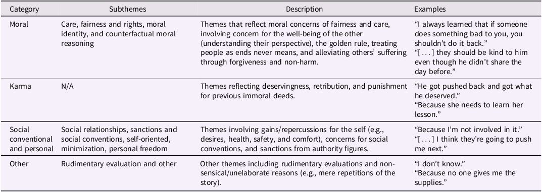 Reasoning data was coded using previously developed schemes that measure children’s reasoning for their emotions in morally relevant contexts (e.g., Jambon et al., Reference Jambon, Colasante, Mitrevski, Acland and Malti2022). We employed a codebook thematic analysis approach and themes were refined or added through the inductive data technique (Braun & Clarke, Reference Braun and Clarke2021). Responses were categorized into: (1) care (e.g., “I know how it feels and it’s not good”), (2) fairness and rights (e.g., “It’s unfair to them”), (3) moral identity (e.g., “I do not feel as though I’m that kind of person”), (4) counterfactual moral reasoning (e.g., “I can just tell them to take turns sharing the book rather than pushing each other”), (5) karma (e.g., “He got pushed back and got what he deserved”), (6) social relationships (e.g., “The other boy won’t be my friend anymore”), (7) sanctions and social conventions (e.g., “The teacher will find out and get angry”), (8) self-oriented (e.g., “because I want to play with the ball”), (9) minimization (e.g., “It’s not my problem so I don’t care”), (10) personal freedom (e.g., “I guess it’s hers so she doesn’t really have to share”), (11) rudimentary evaluation (e.g., “because it’s mean”), and (12) other. A random subsample of responses (i.e., 20% of the data) was independently coded by two research assistants to calculate inter-coder reliability. Reliability was excellent across stories (κ = 0.95). Disagreements were discussed and consensus was attained for the final coding.