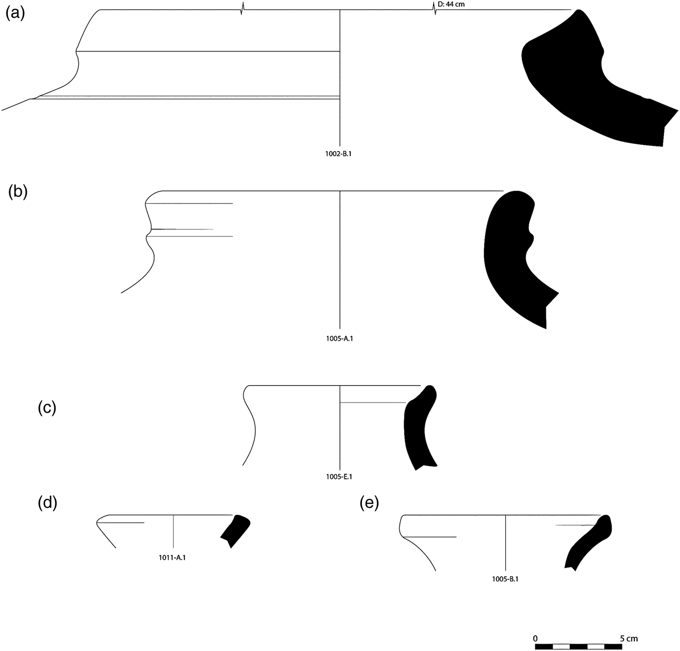 Three large pithos rims were found, with a square-banded profile and the upper part of the lip deliberately pressed down to accommodate a lid (Fig. 11A). The coarse exterior surface of the rim and body was smoothed with a clayey layer, tempered with medium to large size white mineral inclusions. These rims are decorated with horizontal and wavy incised lines under the lip on the exterior. Body sherds from the same pithos are decorated with applied cords.