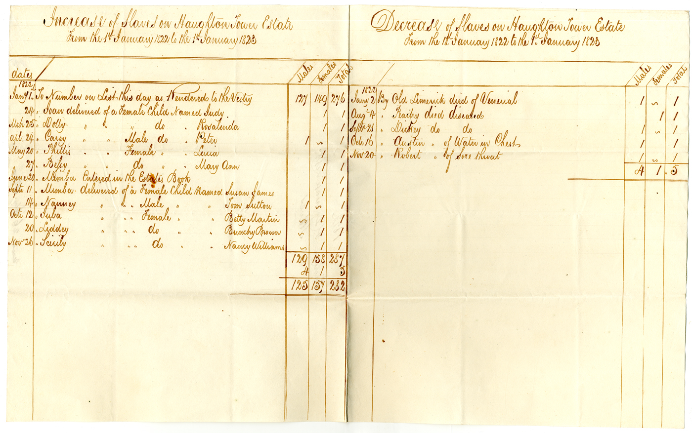 Figure 4 Increase of Slaves on Haughton Tower Estate from the 1st January 1822 to the 1st January 1823. Reproduced with the permission of Melissa James.