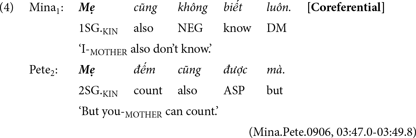 In the Vietnamese context, Tuc (Reference Tuc2003:121) noted that while kin terms generally convey solidarity and respect, pronouns like tao ‘I’ and mày ‘you’ can express either hostility or solidarity depending on the relationship between speakers. These relationships are shaped by social networks and structures, which tend to be less clearly defined in diaspora settings than in the homeland. Nguyen (Reference Nguyen2018) further highlighted this complexity by documenting consistent use of Vietnamese kin terms in code-switching discourse for self- and interlocutor-reference. Crucially, despite some nuanced differences in interpretation, both first- and second-generation speakers regard pronominal kin terms as markers of their “Vietnamese-ness,” using these forms to index their cultural identity. This underscores not only the pragmatic weight carried by Vietnamese pronominal forms but also the speakers’ metalinguistic awareness.