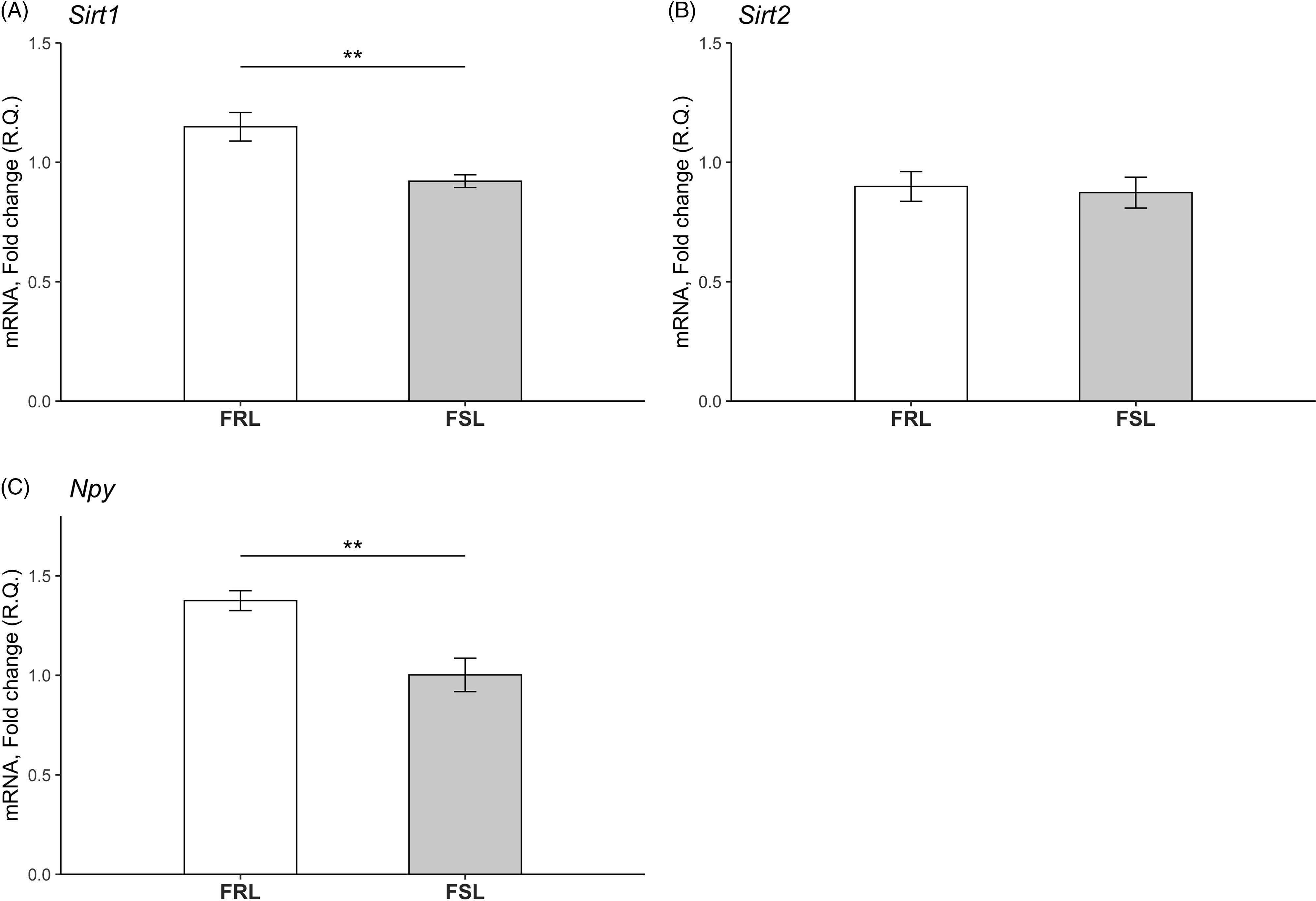 Fig. 2. Relative mRNA levels of the Sirt1, Sirt2 and Npy genes in the hippocampi of young FSL and FRL rats. (A) Sirt1 levels were significantly decreased in young FSL compared to young FRL. (B) No differences in Sirt2 levels between young FRL and young FSL were detected. n = 8 FSL; n = 7 FRL (one outlier in the FSL group in the Sirt1 gene has been excluded) *p < 0.05, **p < 0.01. (C) Npy levels were significantly decreased in young FSL compared to young FRL. The relative quantification (R.Q) bars represent mean values and the error bars represent the standard error of the mean (SEM) n = 8 FSL; n = 7 FRL (one outlier in the FSL group in the Sirt1 gene has been excluded) *p < 0.05, ** p < 0.01.