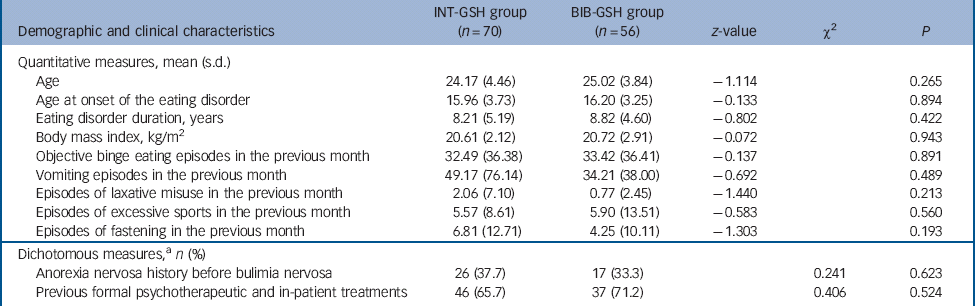Table 1 Comparison of baseline demographic and clinical characteristics of patients with bulimia nervosa in a randomised controlled trial of internet-based guided self-help (INT-GSH) and guided bibliotherapy (BIB-GSH)
