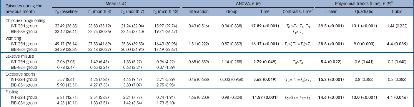 | Episodes during the previous month | Mean (s.d.) | ANOVA, F (P) | Polynomial trends (time), F (P) b | ||||||||