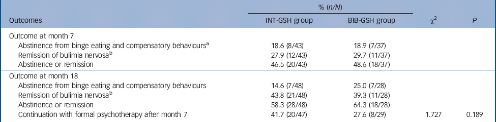 A subgroup of patients continued with formal psychotherapy after the end of treatment (Table 3). Mean duration of post-treatment individual psychotherapy was 11.39 months (s.d. = 7.81) in the INT-GSH group and 7.57 (s.d. = 5.16) in the BIB-GSH group. The subgroup of patients that continued with further psychotherapy had a significantly higher number of weekly episodes of binge eating behaviour (mean 9.15, s.d. = 13.03) than those not continuing with psychotherapy (mean 2.19, s.d. = 2.80) (t = 2.428, P =0.024).