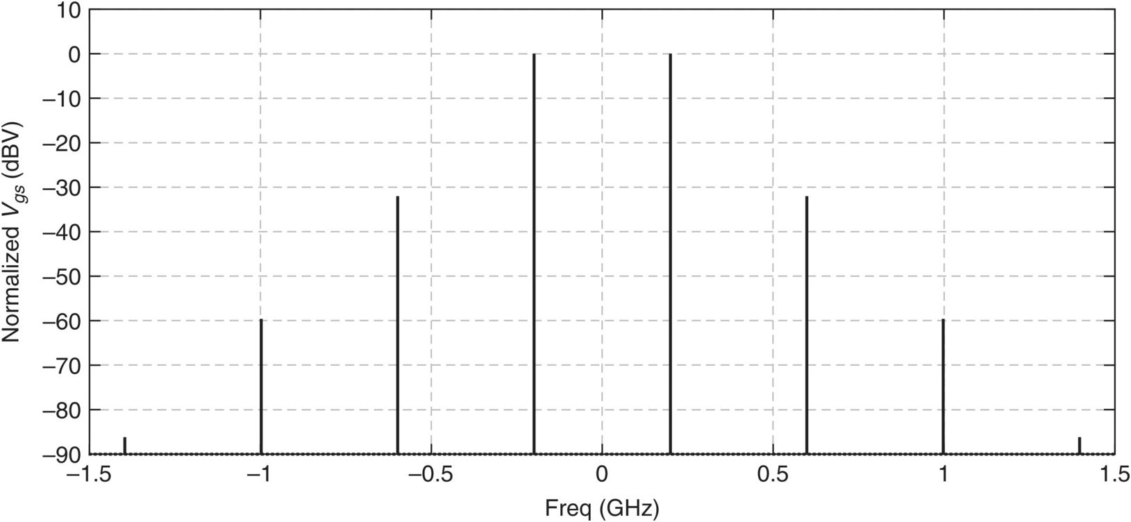 (1.22)which evidences the generation of a linear component, proportional to the input stimulus, a quadratic dc component and second and third harmonics, beyond a cubic term at the fundamental. Actually, it is this fundamental cubic term that is responsible for modeling the amplifier’s gain compression since the equivalent amplifier transconductance gain is