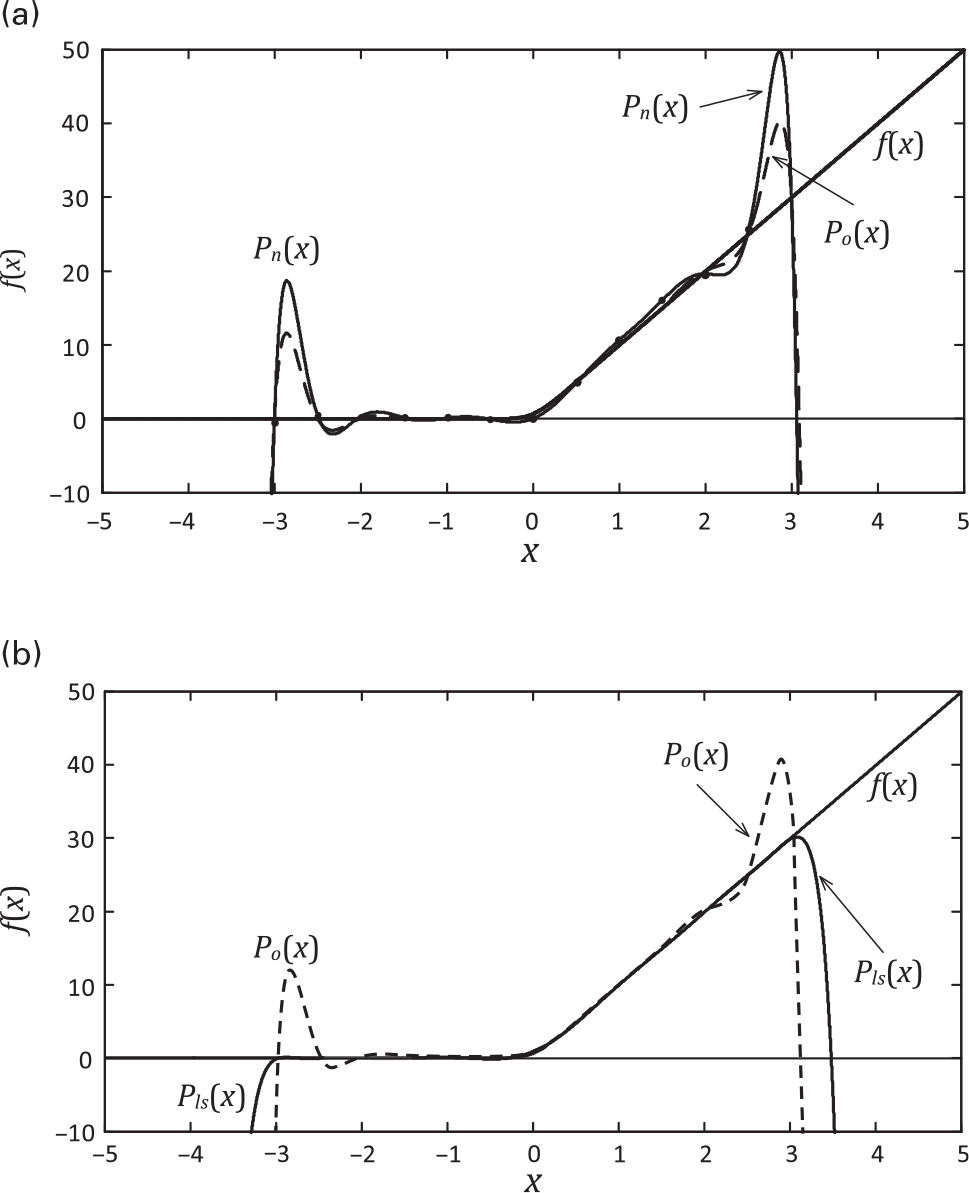 Figure 1.22 The polynomial approximation. (a) Po(x) is a 12’th degree polynomial that passes through 13 ideal, or error free, data points of f(x) in the [−3, +3] input domain, while Pn(x) is a similar polynomial but now extracted from 13 noisy measured data points. (b) Po(x) is the same 12’th degree polynomial of (a) extracted from error free data, while Pls(x) is another 12’th degree polynomial that approximates 200 error corrupted measured data points, in the least squares sense, in the same [−3, +3] input domain.