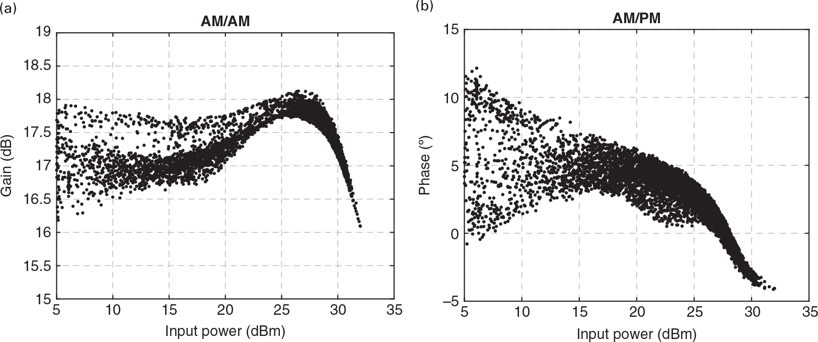 What happens in real amplifiers (see, for example, [Reference Nunes, Cabral and Pedro2]) is that, because of the circuit nonlinear reactive components, or, as was here the case, because of the interactions between linear reactive components (Cgd) and static nonlinearities (iDS(vGS,vDS), which manifests itself as a nonlinear voltage gain, Av), the equivalent gain suffers a change in both magnitude and phase manifested under CW excitation as AM/AM and AM/PM.