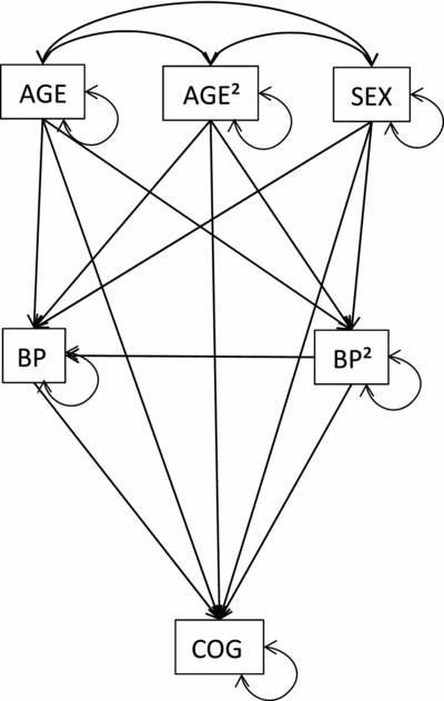 FIGURE 1 Graphical representation of the path model fitted to the data of the whole sample, showing that cognitive test performance (COG) depends on blood pressure (BP) and (mean centered) blood pressure squared (BP2), while regressing out the effects of sex, age, and the mean centered square of age (AGE2).