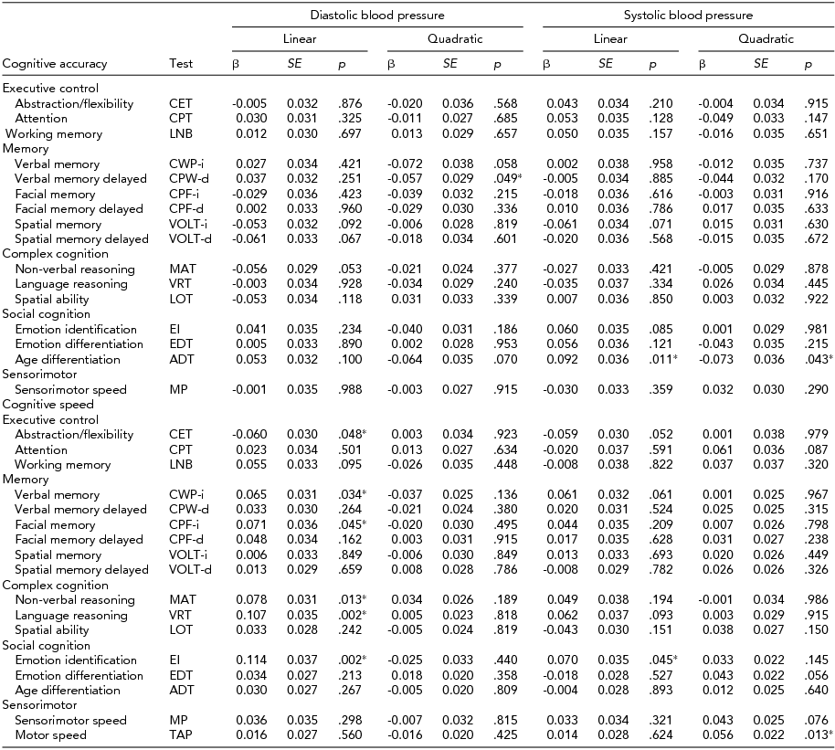TABLE 2 Age- and Sex-Corrected Linear and Quadratic Effects (β; Direct Path Coefficients in Figure 1) of Diastolic and Systolic Blood Pressure on Cognitive Accuracy and Speed Performance, Including Their Standard Errors (SE) and p Values (p)