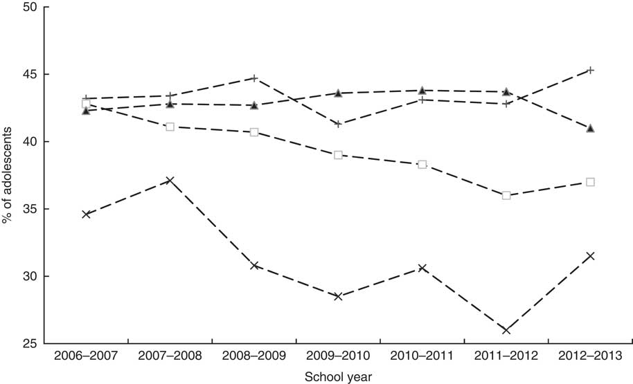 Fig. 5 Percentages of 14-year-old adolescents participating in the Youth Health Monitor meeting the advice for positive screen-time behaviour (<2 h/d), stratified by ethnicity (+-+-+, Dutch; □-□-□, Turkish; ▲-▲-▲, Moroccan; ×-×-×, Surinamese), for school year 2006–2007 until school year 2012–2013, Amsterdam, the Netherlands. Odds ratios and 95 % confidence intervals adjusted for sex, age, district of Amsterdam and educational level, for school year 2012–2013 v. 2006–2007: Dutch (OR=1·00; 95 % CI 0·98, 1·03), Turkish (OR=1·11; 95 % CI 1·07, 1·16), Moroccan (OR=1·05; 95 % CI 1·02, 1·08), Surinamese (OR=1·10; 95 % CI 1·05, 1·14)