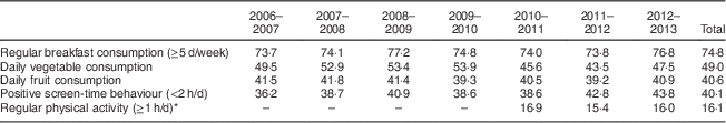 Questions on physical activity were modified in the electronic questionnaire in school year 2010–2011. In the paper questionnaire, physical activity questions were only related to active transport to school and participation in sports in leisure time. However, in the electronic questionnaire, two questions on physical activity were added, resulting in four different topics related to physical activity: (i) participation in sport activities outside; (ii) participation in sport activities in a sports club; (iii) school gymnastics; and (iv) active transport to school (walking or cycling). A last question was added (based on those four different physical activities) to assess the percentage of children who meet the Dutch healthy exercise norm (NNGB) of being physically active for at least one hour per day( Reference Kemper, Ooijendijk and Stiggelbout 25 ). Because this question was not included in the paper questionnaire, it was only possible to assess the three-year trends in physical activity (2010–2011 to 2012–2013). The question used to assess how many children were physically active for more than one hour per day was: ‘Think of last week. How many days of this week did you spent at least one hour on these activities? Thus walking or cycling from and to school, gymnastics at school, participation in sport activities in a sports club and/or sport activities outside a sports club (for example, playing soccer on the streets)’( Reference Chinapaw, Slootmaker and Schuit 26 , Reference Wendel-Vos, Schuit and Saris 27 ). Response values ranged from 0 to 7. To calculate the percentage of children meeting the guideline of at least one hour of physical activity each day, responses were dichotomized based on the number of days per week (<7 or 7 d/week).