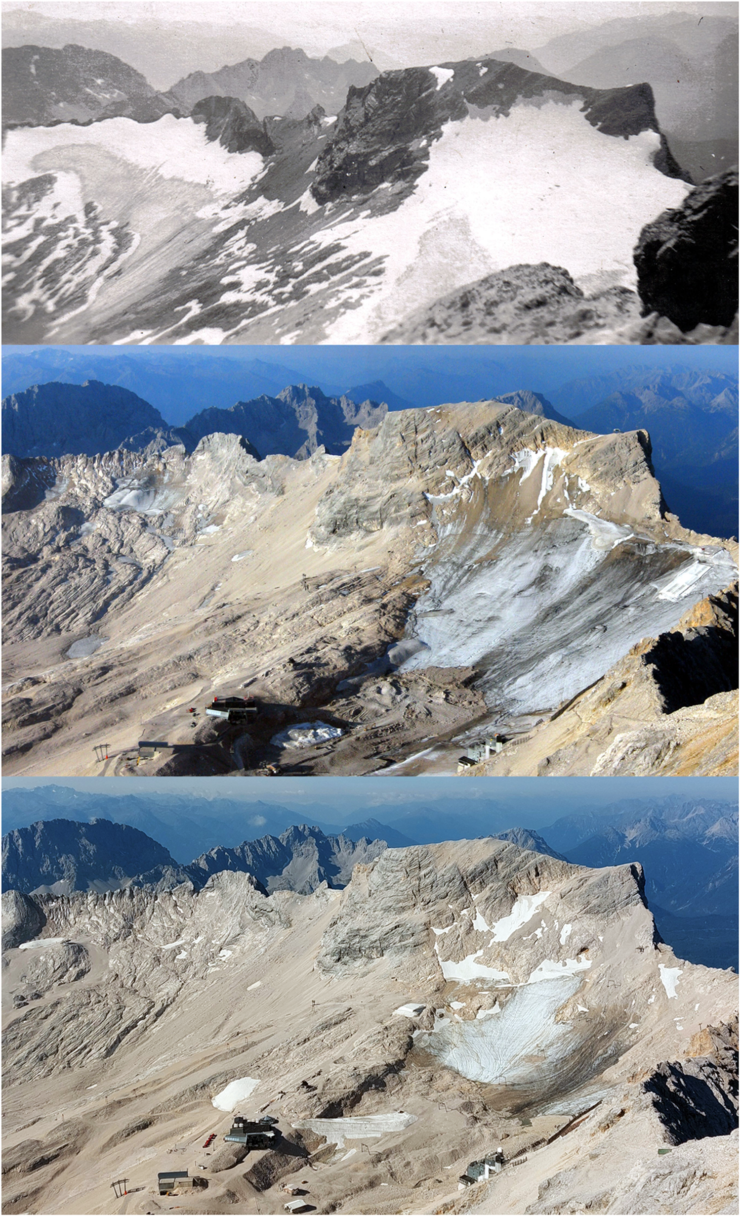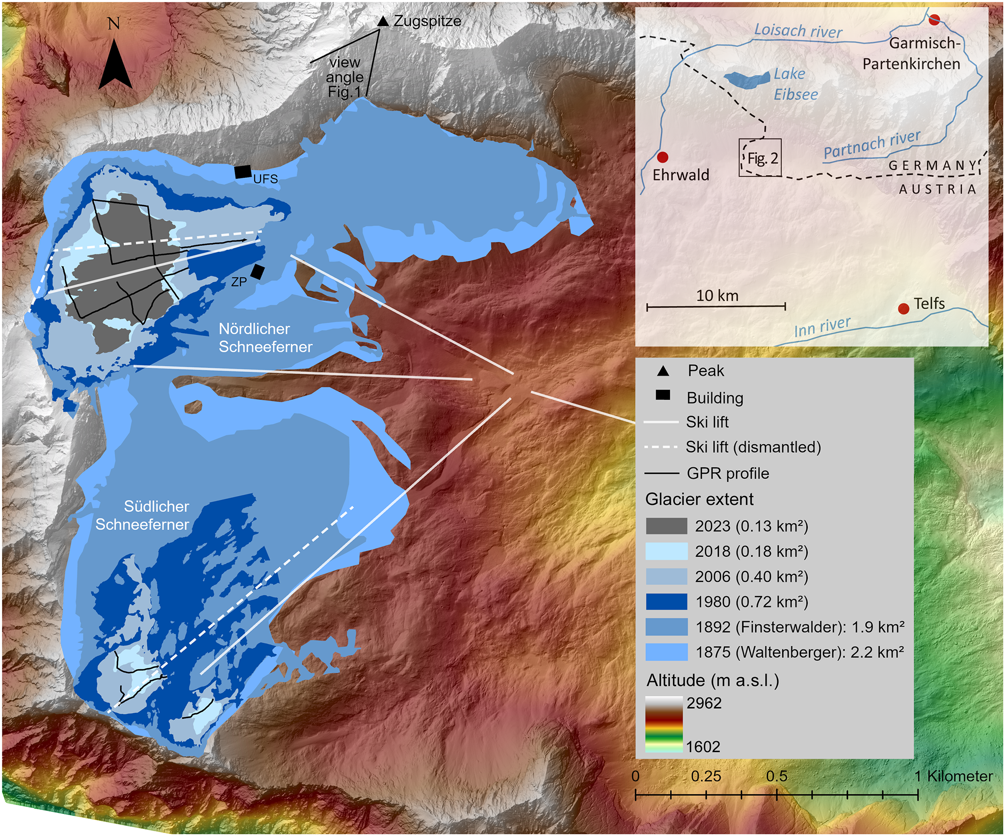 Mountain glaciers around the world are known to be strongly affected by climate change. From 2000 to 2023, the global mass loss was 5.4%, with a regional maximum of 38.7% in Central Europa (The GlaMBIE Team, 2025). While the largest glaciers of the European Alps still have a chance to persist until 2100, medium-sized glaciers will disappear in this century (Rückamp and others, Reference Rückamp, Cheng, Gutjahr, Möller, Pellikka and Mayer2025) and the vanishing of low-lying cirque glaciers has already begun. The Zugspitzplatt is an undulated but relatively low-sloping, tertiary-aged paleo-surface located within the Wetterstein Mountains, just below the summit of Zugspitze (2963 m a.s.l.), Germany’s highest peak. This karst plateau covers an area of about 6 km2, reaching from approximately 2000 m a.s.l. to roughly 2700 m a.s.l. and is surrounded by steep walls on three sides. During the glacial periods, this high-elevated region acted as an accumulation area for a glacier flowing down the Rein Valley, ultimately integrating into the Pleistocene Alpine ice field. In the Late Glacial, the ice detached again from the ice field and formed a valley glacier named Partnachgletscher. With the beginning of the Holocene, the glacier retreated to the ‘Platt’ (plateau), and was subsequently named ‘Plattachferner’ and later ‘Schneeferner’. Geomorphologic investigations and the evaluation of historical sources like maps and paintings showed that this glacier reached its Little Ice Age (LIA) maximum already around 1820 with a total area of 0.3 km2 (Hirtlreiter, Reference Hirtlreiter1992). Due to the plateau’s gentle topography, the glacier lacked a large elevation range, rendering it highly vulnerable to climatic shifts such as the post-LIA rise in the equilibrium line altitude (ELA). In the following, the glacier evolution during the modern era is illustrated in the context of infrastructural development and tourism.
